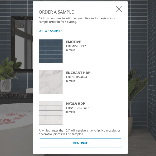 The Sample Request Module allows you to choose a sample while using the Visualizer. (Note: A 4x4 sample chip will be sent for any selection larger than 24”, and no mosaics or decorative pieces can be ordered online.)
